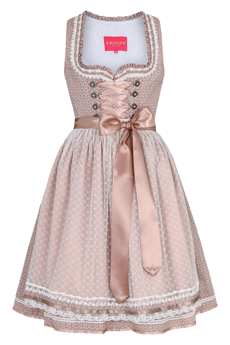 Ein wunderschönes Dirndl in Altrosa mit 60cm Rocklänge von Krüger Madl. Der Ausschnitt ist reich mit Rüschen und Spitzenreihen eingefasst. Das Mieder schmückt eine Schnürung mit aufwändig gestalteten Haken, deren Glitzersteine funkeln. Die durchsichtige Schürze aus cremefarbener Spitze ist mit altrosa Satin gefuttert. Schürze und Kleid schließen mit mehrreihigen Spitzen und Satinbändern ab. An den Seiten des Kleides sind zwei Einschubtaschen eingearbeitet.