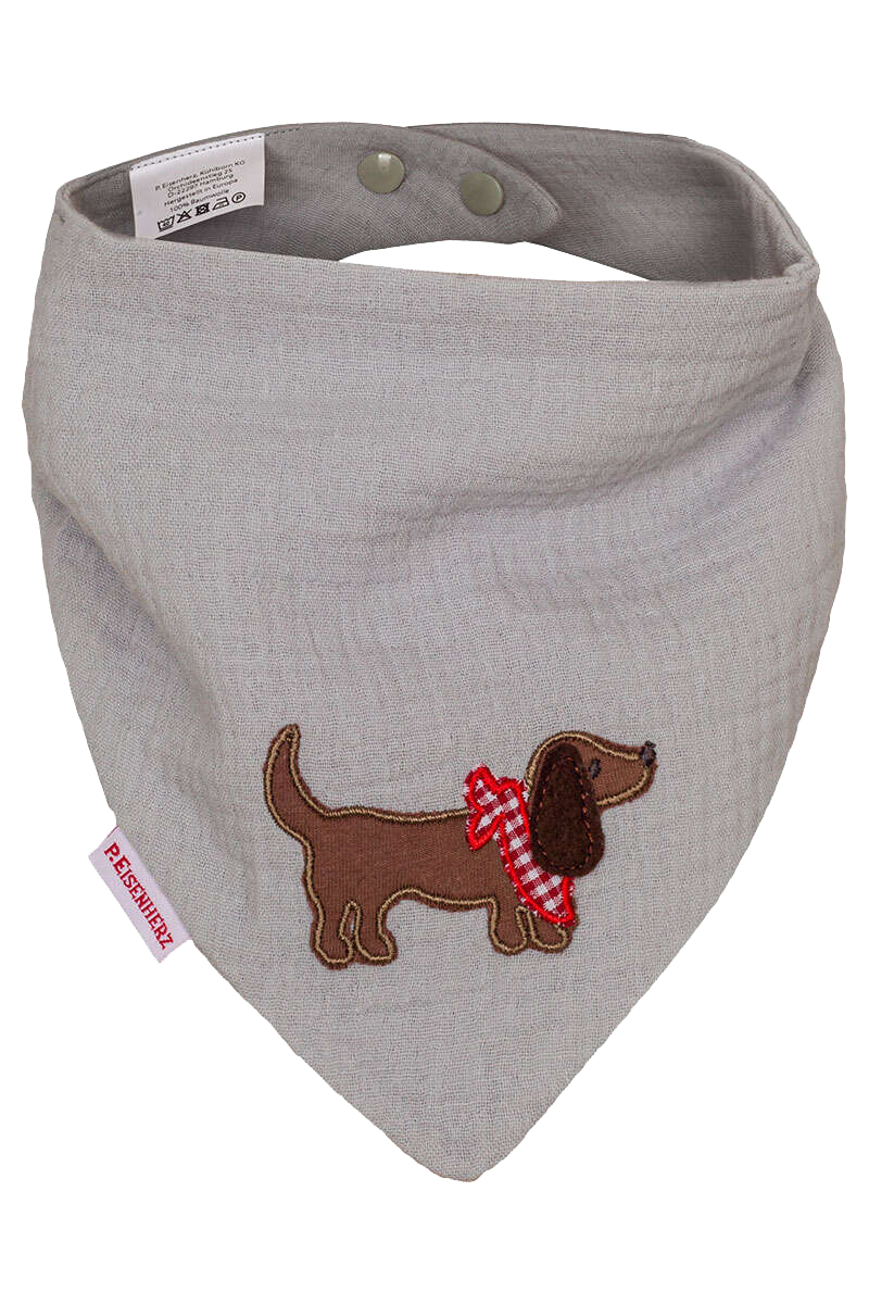 Dieses süße Dreieckstuch der Marke P.Eisenherz aus reiner Baumwolle ist ein Muss für unsere kleine Trachten- und Hundefans. Das graue Tuch ist in Dreiecksform gearbeitet. Das Musselin fühlt sich besonders weich auf der Haut an und ist daher besonders angenehm zu tragen. Besonders niedlich ist das gestickte Motiv des Dackels, der passend dazu ein Tuch mit dem traditionellen weiß-roten Karomuster der Tracht trägt. Die Farbe ist sowohl für Mädchen als auch für Jungen geeignet. Das Tuch ist mit einem praktischen Druckknopf versehen, der sich in zwei verschiedenen Größen verstellen lässt.Dieses Produkt wurde in Europa hergestellt.