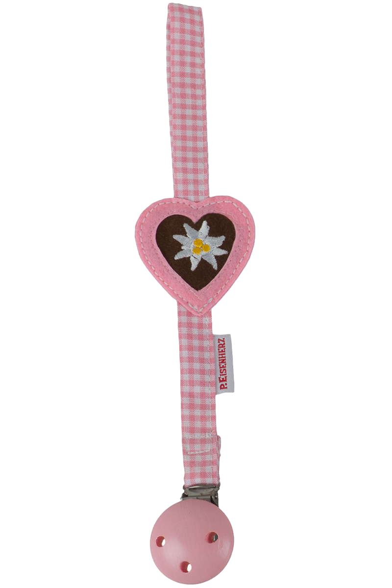 Ein neuer Zuwachs in der Schnuller-Band-Kollektion von Prinz Eisenherz. Dieses Accessoire für Trachten-Babys ist in rosa kariert gehalten und in der Mitte ein schönes Filz Herz mit Edelweiß und wie gewohnt in der selben praktischen Ausführung mit Clip und Gummi für den Schnuller.