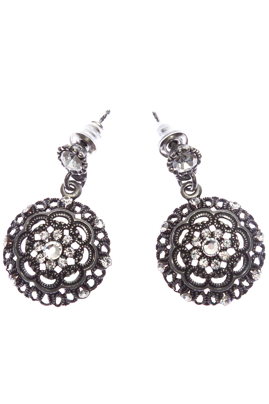 Der ca. 2 cm große, runde Ornament-Anhänger besticht durch sein florales Design und ist mit unterschiedlich großen, funkelnden Strasssteinchen kunstvoll verziert. Das zarte Spiel aus Form und Glanz macht diese Modeschmuck-Ohrstecker zu einem charmanten Blickfang, der Tradition und moderne Eleganz perfekt verbindet.