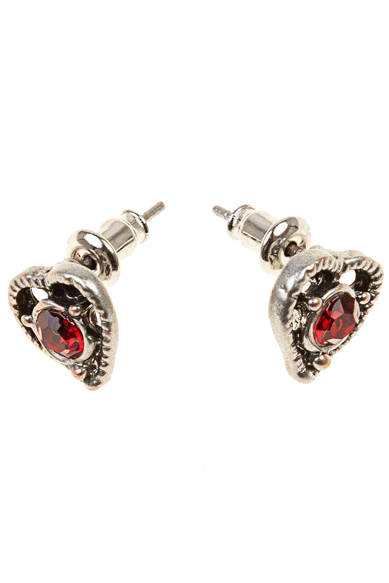 Ein zierliches Paar Ohrstecker in Altsilber von Silkdrops. Die 8 mm große, metallene Herzform umfasst einen weinroten Glitzerstein mit drei Haltepunkten.