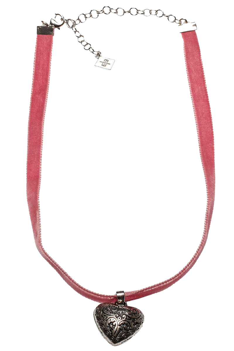 Das 45 cm lange Halsband aus Samt in Altrosa wird mit einer variablen Metallgliederkette und Karabiner geschlossen. Sie hält einen Anhänger in Herzform aus ziseliertem Metall in Altsilberoptik. Das Band ist der ideale Schmuck zu einem Dirndl-Dekolleté.