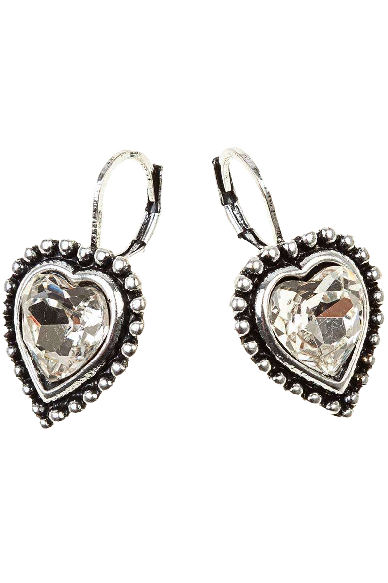 Die Ohrringe in Altsilber von Silkdrops sind in Herzform gestaltet und weisen eine Größe von 20 mm auf. Der herzförmige weiße Glitzerstein wird von einer glatten Metalleinfassung und einer weiteren Einfassung mit Pünktchen umrahmt.