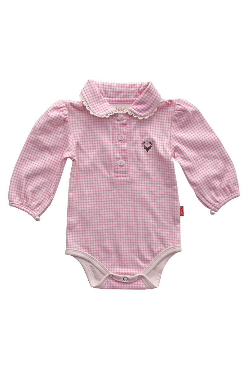Ein herziger Babystrampler in rosa Karo von Mogo für Mädchen. Der Halsausschnitt wird von einem Umlegekragen mit weißer Spitze geschmückt. Die Knopfleiste mit perlenförmigen Knöpfen erleichtert das An- und Ausziehen. Die Ärmel sind am Saum ebenfalls knöpfbar. Auf der linken Brust ist ein hübsches Hirschkopflogo aufgestickt. Der Strampler ist aus pflegeleichtem Baumwolljersey gefertigt.