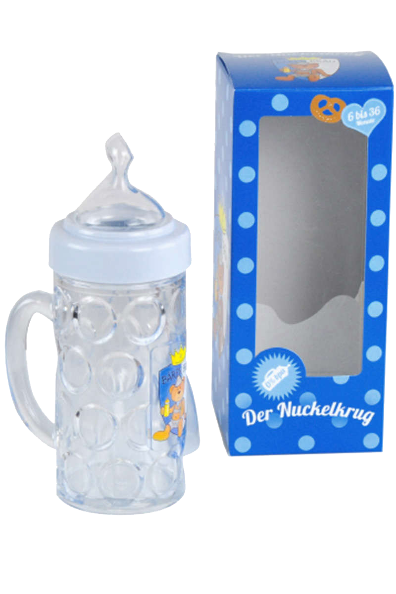 Der blaue „Nuckelkrug" der Firma Wolke 3 ist die innovative Flasche in Maßkrug Form für die Jüngsten unter den Trachtlern. Der Krug hat ein Fassungsvermögen von 250 ml und fast alle Merkmale der handelsüblichen Zwergerl-Flaschen. Also ein absolutes Must Have für kleine Erdenbürger ab 6 Monaten. Auf der glasklaren Flasche ist ein Emblem aufgedruckt mit einem alpinen Bären mit Sepplhut und mit der Aufschrift Bären-Bräu versehen.Für den Auslaufschutz sorgen eine Schutzkappe und Dichtungsplättchen.Ob Tee oder Brei, durch die extra große Öffnung ist der rote „Nuckelkrug" besonders einfach zu reinigen. Ein BPA freier Kunststoff und Silikonsauger stehen für die gute Qualität des „Kruges".Da unser „Nuckelkrug" etwas ganz Besonderes ist muss er daher gut gepflegt und mit viel Liebe behandelt werden.Bitte reinigen Sie den „Krug" nur von Hand und bitte nicht auskochen oder sterilisieren.Den Schraubverschluss mit dem Trinksauger und dem Deckel können Sie dagegen auch in die Spülmaschine geben, da diese hoher Hitze aushalten.ACHTUNG!Verwenden Sie dieses Produkt nur unter Aufsicht von Erwachsenen.Der „Krug" ist zwar aus stabilem Material aber nicht 100 % bruchsicher, Vorsicht auf harten Böden!Lieferumgang: 1 Baby-Flasche , made in Bayern!Lässt sich mit Weithals-Flaschensaugern der Größe 2, wie zum Beispiel von NUK oder Baby Nova, kombinieren.