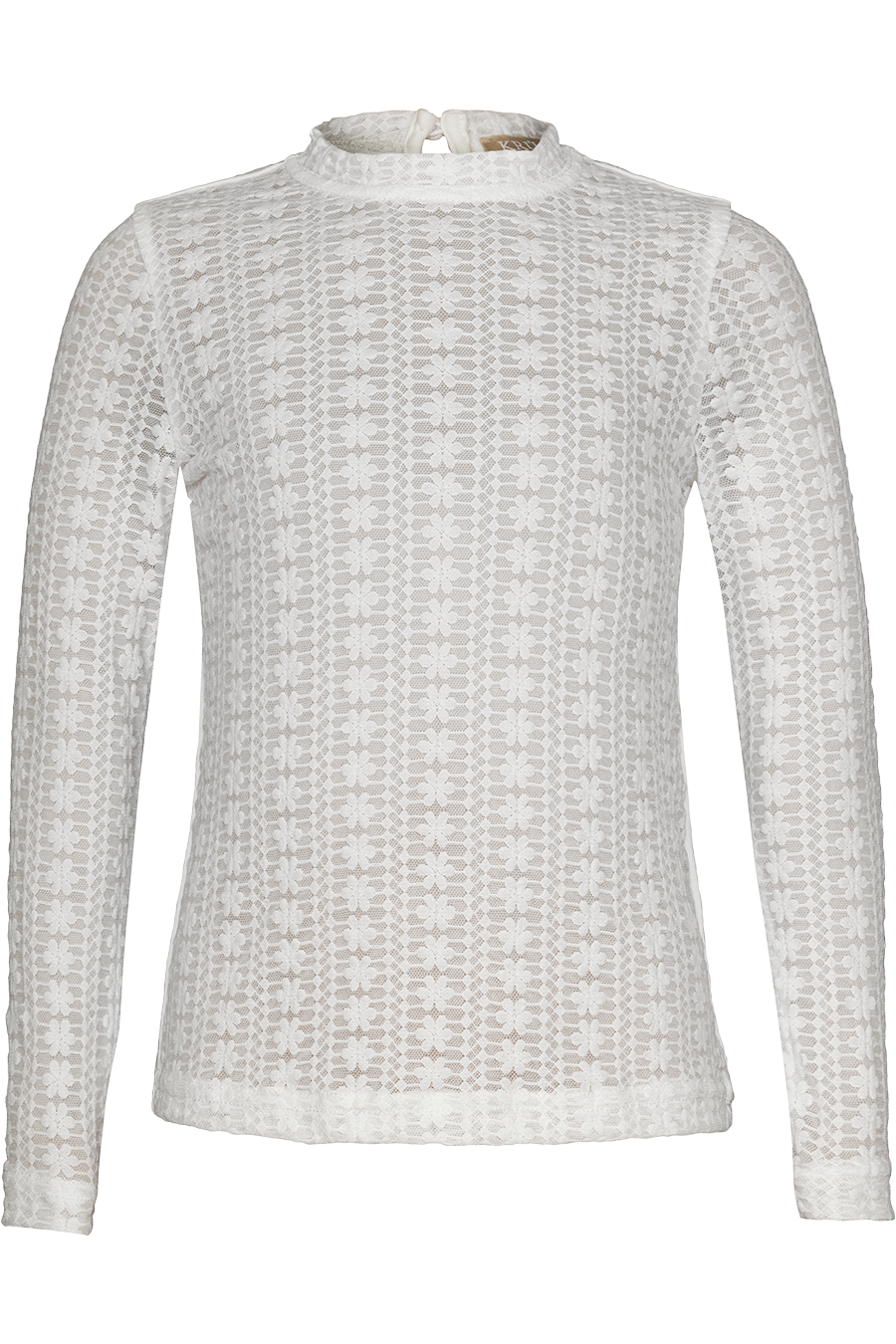 Die Vorderseite und Ärmel bestehen aus feinem Spitzenstoff mit floralem Muster, der dem Shirt eine niedliche und zugleich zeitlose Ausstrahlung verleiht. Ein zarter Stehkragen aus Spitze unterstreicht den hochgeschlossenen Look und verleiht der Bluse eine elegante Note. Dank des Stretchanteils sitzt sie bequem und macht jede Bewegung mit. Die Rückseite besteht aus elastischer Baumwolle mit Stretch, was zusätzlichen Tragekomfort garantiert.