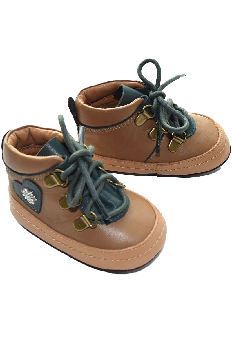 Baby Trachten-Schuhe im Bergsteiger-Look von der Fa. Mogo. Diese stylischen beigen Schnürboots sind passend zum Wiesenoutfit für die Kleinsten. Ein sehr weicher und hochwertiger Schuh aus 100 % Leder mit einer dunkelbraunen Velourledersohle. Die Schnürsenkel und die Zunge sind aus grünem Leder, genau wie das applizierte Herz mit einem Edelweiß-Pin aus Metall.