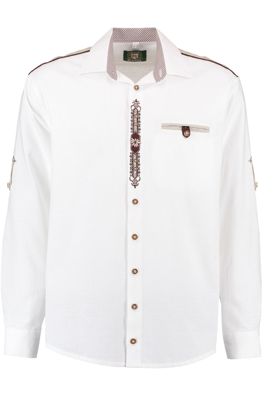 Feine kontrastfarbige Stickereien und elegante Edelweiß-Motive entlang der durchgehenden Knopfleiste setzen stilvolle Akzente. Der praktische Krempelarm lässt sich mit einem Riegel fixieren und sorgt für einen lässigen Look.
