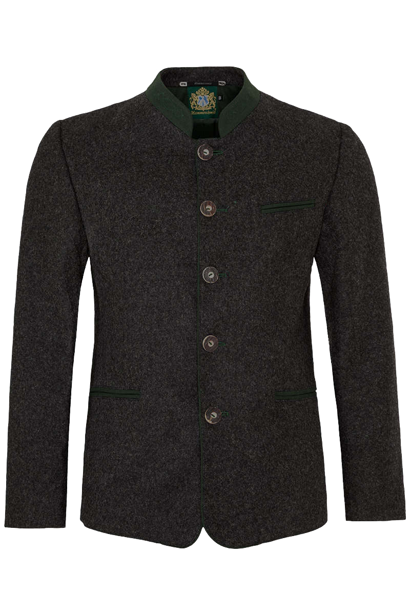 Die Jacke aus Gebirgsloden hat einen tannengrün abgesetzen Stehbundkragen, welcher dezent bestickt ist. Die ebenfalls tannengrün paspolierten Taschen sowie die eingefassten Knopflöcher lockern das Erscheinungsbild des anthrazitfarbigen Lodens auf. Die Kellerfalte im Rücken darf bei diesem Klassiker natürlich nicht fehlen. Geschlossen wird die Jacke mit Knöpfen auf Tierbein.