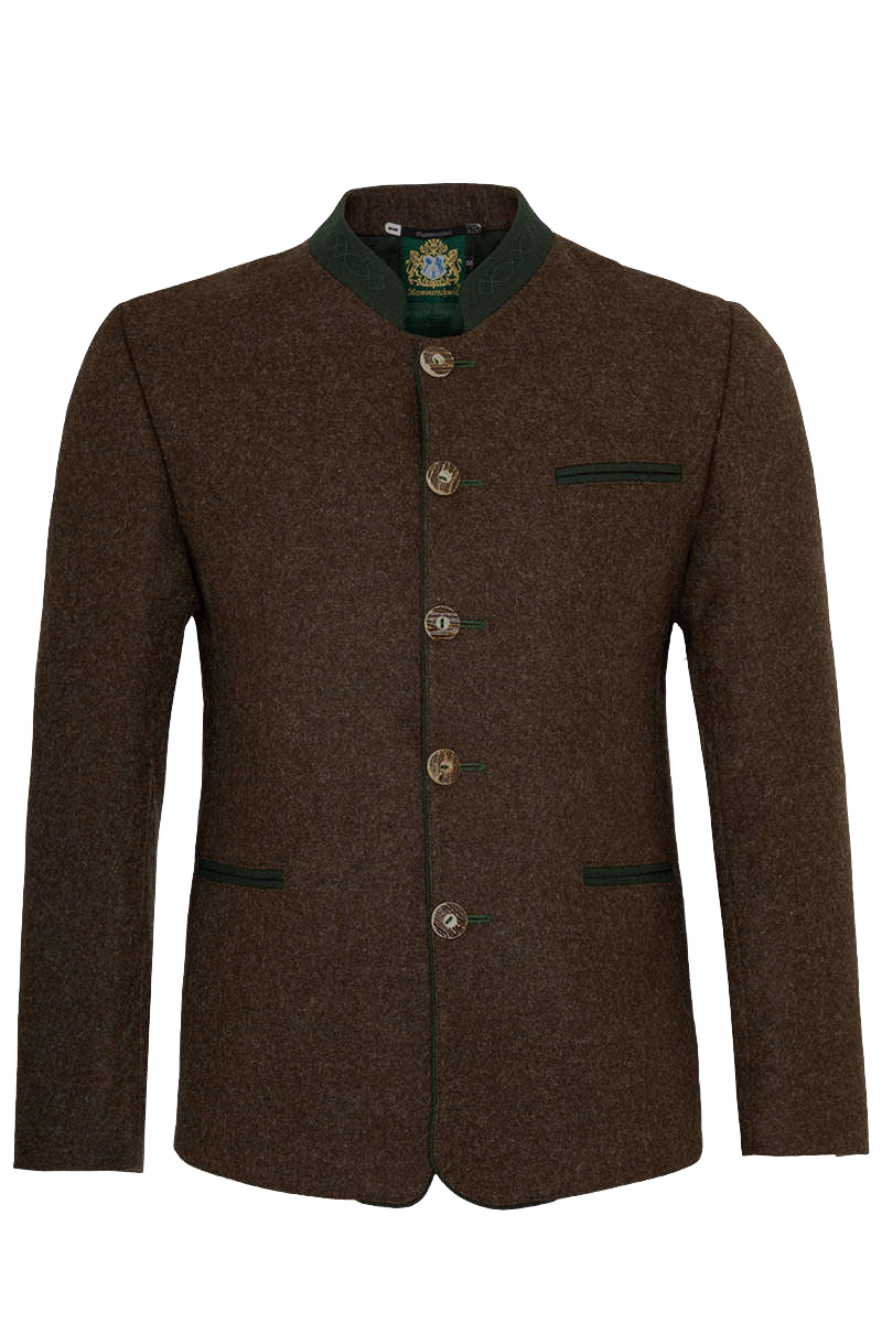 Der Klassiker! Diese wunderschöne Lodenjoppe können Sie stilecht zur Kniebundhose kombinieren, aber genauso gut auch zur langen Lederhose sowie zur Jeans tragen.Die Jacke hat einen tannengrün abgesetzen Stehbundkragen, welcher dezent bestickt ist. Die tannengrün paspolierten Taschen sowie die eingefassten Knopflöcher lockern das Erscheinungsbild des braunen Lodens auf. Geschlossen wird die Jacke mit Knöpfen auf Tierbein. Die Kellerfalte im Rücken darf bei diesem Janker aus Gebirgsloden natürlich nicht fehlen. Ausgestattet ist die braune Jacke mit zwei Innentaschen und tannengrünem Innenfutter.Was ist Loden?Die Herstellung von LodenFür die Herstellung von Loden sind je nach Qualität 20-25 Arbeitsgänge erforderlich. Auf einer besonders breiten Webmaschine wird ein Gewebe gebildet, das man als Rohware bezeichnet.Die Rohware wird auf die Walkmaschine genommen und unter Einwirkung von reinem Wasser, Druck und Wärme 2 - 4 Stunden zwischen 2 Walzen so lange gestaucht und geknetet ("gewalkt") bis er verfilzt. Die Wollfasern verhaken sich dabei ineinander. Durch diese Tortur verdichtet sich das Gewebe und schrumpft in der Länge und Breite um ca. 20%.Jetzt wird die Ware 1-2 Stunden gewaschen und anschließend in der Trockenappretur die abstehenden Fasern des Tuchlodens auf einer Schermaschine abgeschoren, so dass eine glatte Gewebeoberfläche entsteht.Weiter wird der Loden einer Dampfbehandlung unterzogen, um das Warenbild zu fixieren und das Gewebe krumpffrei zu machen. Loden ist Natur pur und weist viele positiven Eigenschaften auf: Wasserabweisend:Durch die aufwendige Verarbeitung der Schurwolle, dem Walken, wird der Loden nicht nur wärmer, widerstandsfähiger und knitterarm, sondern auch extrem wasserabweisend.Temperaturausgleichend:Zu warm oder zu kalt gibt es bei Loden nicht. Denn durch seine Strukturierung findet ein regelmäßiger und kontrollierter Wärmeausgleich statt. Es entsteht eine Mikroklimazone am Körper. Loden hält die Körperwärme zurück, lässt die Kälte nicht durch und garantiert dadurch außergewöhnlichen Tragekomfort.Atmungsaktiv: Reine Schurwolle ist äußerst atmungsaktiv, d.h. sie nimmt den Wasserdampf vom Körper und gibt ihn an die Gewebeoberfläche ab. Dieser Faktor ist wichtig bei Oberbekleidung für den sportiven Bereich, z.B. für Wanderer und BergsteigerWinddicht:Ein Lodenjanker ist ein wahrer Windbreaker. Durch eine Verarbeitung ohne chemische Zusätze bleibt das windbrechende Verhalten des Lodens erhalten. Windstärke 10 ist für Loden kein Problem.Schmutzresistent:Auf Grund der Warenstruktur und des Wolllanolin (Wollfett) ist reine Schurwolle absolut schmutzunempfindlich. Schmutz und Dreck kann in trockenem Zustand leicht abgebürstet werden.