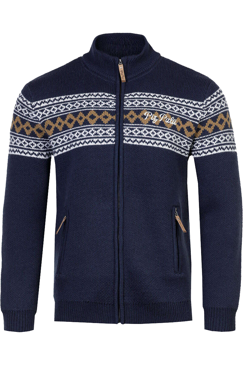 Die sportive dunkelblaue Herren-Strickjacke SCHWABBRUCK von Piz Palü ist vor allem durch das Norwegermuster in weiß und senfgelb ein echtes Fashion-Highlight.Der Stehkragen, der hochgeschlossene Reißverschluss und die beiden seitlichen Einschubtaschen sorgen für wohlige Wärme vorm winterlichen Kaminfeuer.Leder-Patches an den Reißverschluss-Zippern, sowie die farblich abgesetzten Ellenbogen aus hellbraunem Walk unterstreichen den legeren Look. Ein eingesticktes Markenlogo im Brustbereich vervollständigt den sportlichen Alpenstil der vielseitigen Jacke.