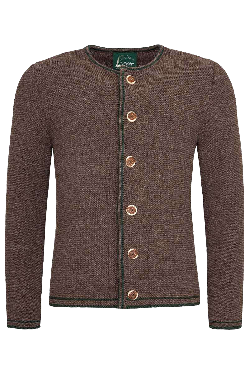 Mit dieser braunen melierten Herren Trachtenjacke aus 100% Schurolle von Litzlfelder hollt "Mann" sich einen absoluten Klassiker ins Haus. Die Jacke ist sehr hochwertig verarbeitet und mit viel Liebe zum Detail in Bayern designt und gefertigt. Der gerade und zeitlose Schnitt macht die Jacke zu einem Trachten-Klassiker. Der Halsausschnitt, der Bund der Jacke und die Ärmel und die Knopfleiste sind farblich abgesetzt in grün geziert. Zudem hat die Jacke eine abgesetzte, rechtsgestrickte Rückennaht. Die vielen handgearbeiteten Details macht jede Strickjacke zum Unikat. Für ein besonderes Tragegefühl wurde feinste Schurwolle aus Deutschland und Österreich verwendet. Abgerundet wird das harmonische Erscheinungsbild der Jacke durch die großen Knöpfe in Hirschhornoptik.
