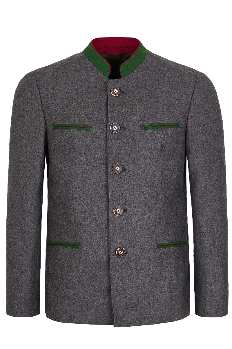 Produktinformationen:Dieses wunderschöne Trachtensakko der Marke Tofana aus grauem Walk ist sehr klassisch gehalten. Das Sakko hat einen tannengrünen abgesetzten Stehbundkragen, welcher rot gefüttert ist. Die tannengrün paspelierten Taschen und Ärmelabschlüsse lockern das Erscheinungsbild auf. Ausstattung:Ausgestattet ist das Sakko mit zwei Innentaschen, zwei Einschubtaschen und zwei Brusttaschen. Das Innenfutter des Sakkos ist grün gehalten. Die Knöpfe sind aus Hirschhorn gearbeitet.