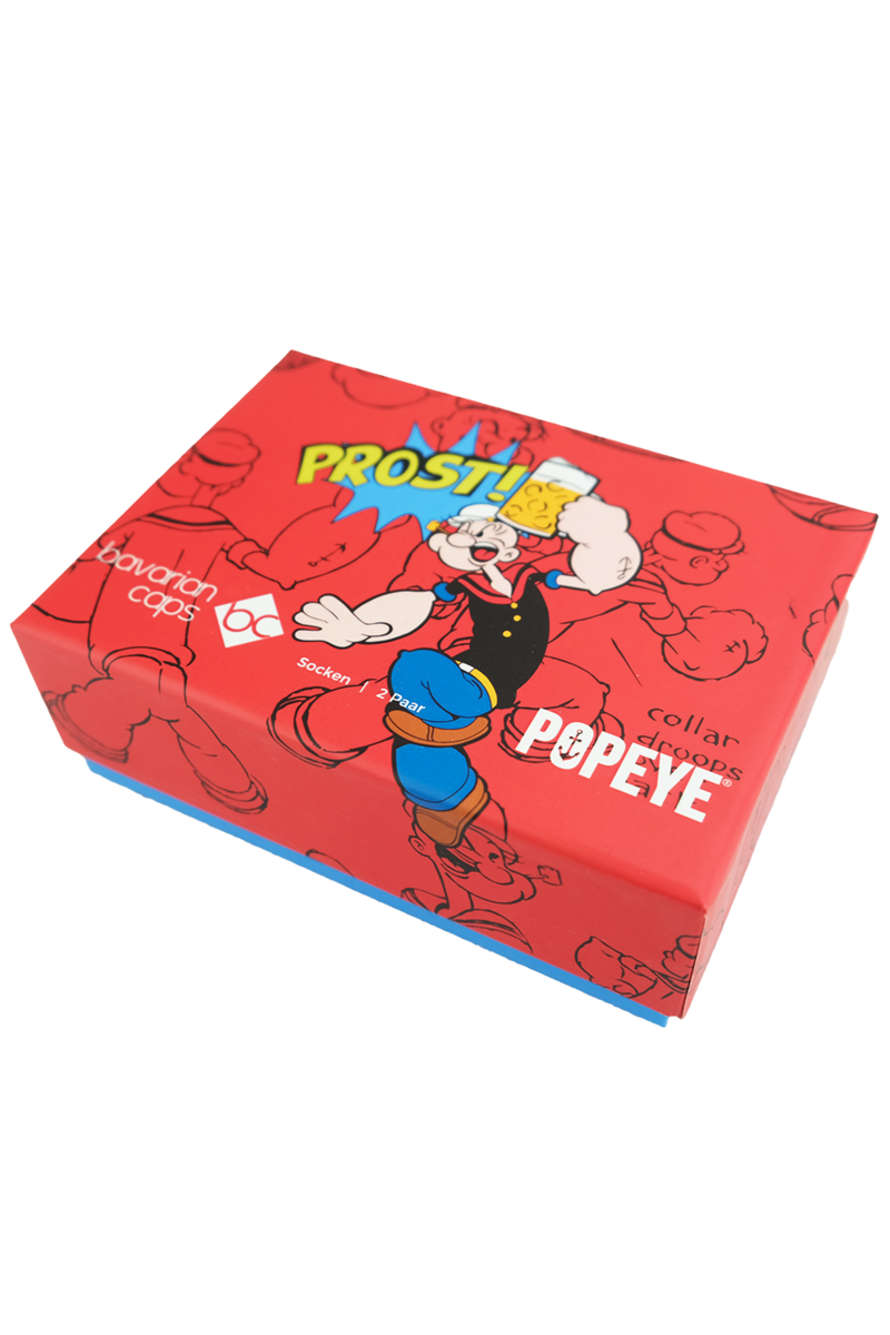 Die Sockenbox "POPEYE" von Bavarian Caps eignet sich hervorragend als Geschenk und sorgt garantiert für ein Schmunzeln. Die Box enthält 2 Paar Socken mit Baumwollanteil: ein rotes Paar mit gelben Schriftzügen "PROST!" und ein blaues Paar mit Popeye-Motiv der mit seinen dicken Unterarmen ein volles Maß Bier in die Höhe stemmt. Auch die Box ist mit diesem Motiv bedruckt und ein echter Hingucker.