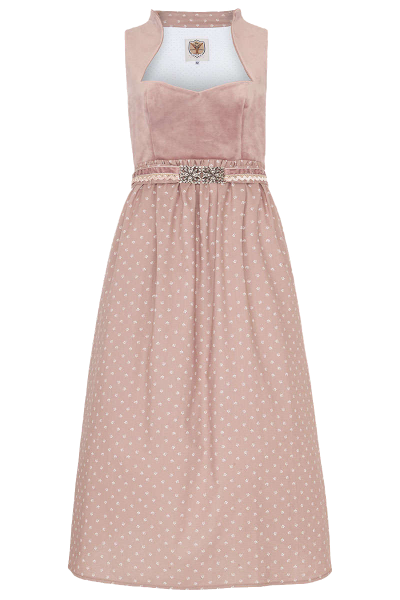 Ein Dirndl für werdende Mamas, indem der wachsende Babybauch genügend Platz findet und auch noch wunderschön zur Geltung kommt. Das Umstandsdirndl von Apple of my Eye in der Farbe Altrosa wirkt besonders durch seine klassisch schlichte Ausführung. Das Oberteil aus weichem Samt weist einen eleganten, fein paspelierten Ausschnitt auf. Der 85 cm lange Rock in Rosa ist mit kleinen weißen Blüten bedruckt. Anstelle der sonst üblichen Dirndlschürze ist das Kleid mit einem hübschen Gürtel mit Spitzenbesatz und Metallschließe in Altsilber ausgestattet.