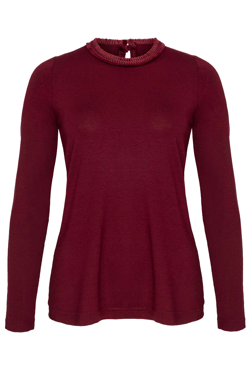 Das weinrote Langarm-Shirt DORLI von Wenger ist aus einem besonders anschmiegsamen Baumwolljersey mit Stretchanteil gefertigt. Der hochgeschlossene Rundkragen ist von einer hochwertigen Borte eingefasst und wird am Rücken mit einem Rundknopf geschlossen. Der körpernahe Schnitt weist einen 62 cm langen Rücken und 61 cm lange Ärmel auf.