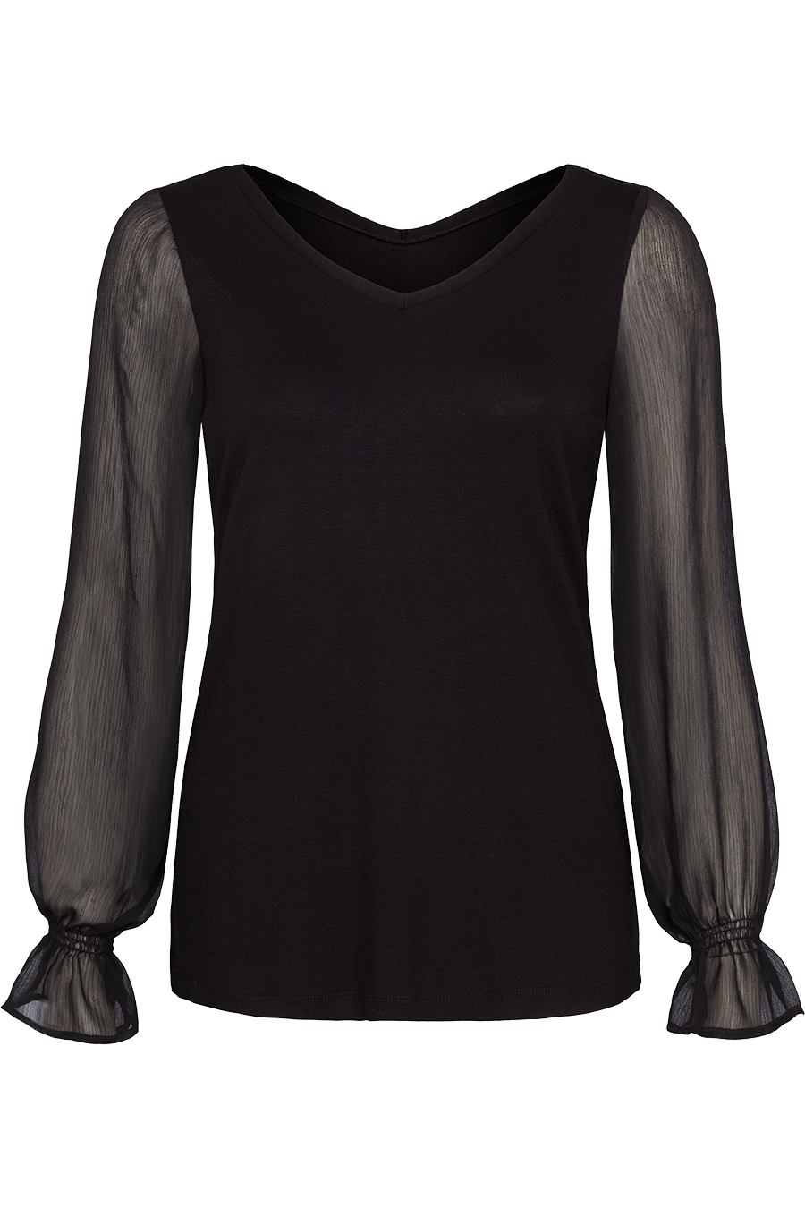 Die langen, weiten Ärmel aus semitransparentem Chiffon verleihen dem Blusenshirt einen leichten, eleganten Charakter. Am Armabschluss sorgt eine feine Gummibund-Raffung für einen sanften, femininen Fall.