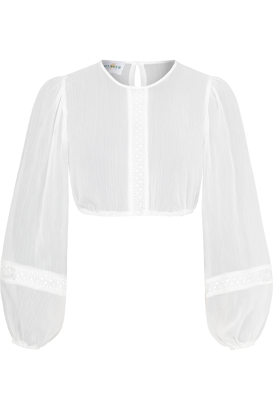 Die Dirndlbluse DAVINA von Wenger ist ein echter Blickfang für jeden festlichen Auftritt. Die transparente Optik mit feinen Spitzeneinsätzen in der vorderen Mitte und an den Ärmeln verleiht Ihrem Outfit einen Hauch von Eleganz und Sinnlichkeit. Der hochgeschlossene Schnitt mit Knopf und Schlaufe im Nacken sorgt für eine stilvolle Note, während die leicht gerafften, weiten Ärmel mit elastischen Abschlüssen und der flexible Gummibund am Saum für einen perfekten Sitz und höchsten Tragekomfort stehen. Eine Bluse, die Ihr Dirndl auf besonders edle Weise ergänzt.