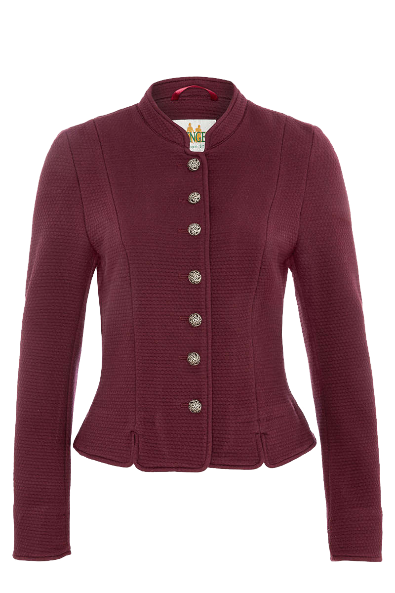 Mürz ist eine elegante Damenjacke aus bordeauxfarbener Stretch mit feiner Webstruktur. Der Schnitt mit den Wiener Nähten und dem ausgestellten Saum mit mehreren Schlitzen ist betont körpernah gehalten. Auf dem dunklen Stoff heben sich die ziselierten Metallknöpfe besonders effektvoll hervor. Die hochwertige Verarbeitung zeigt sich unter anderem an der Paspelierung aller innenliegender Nähte.