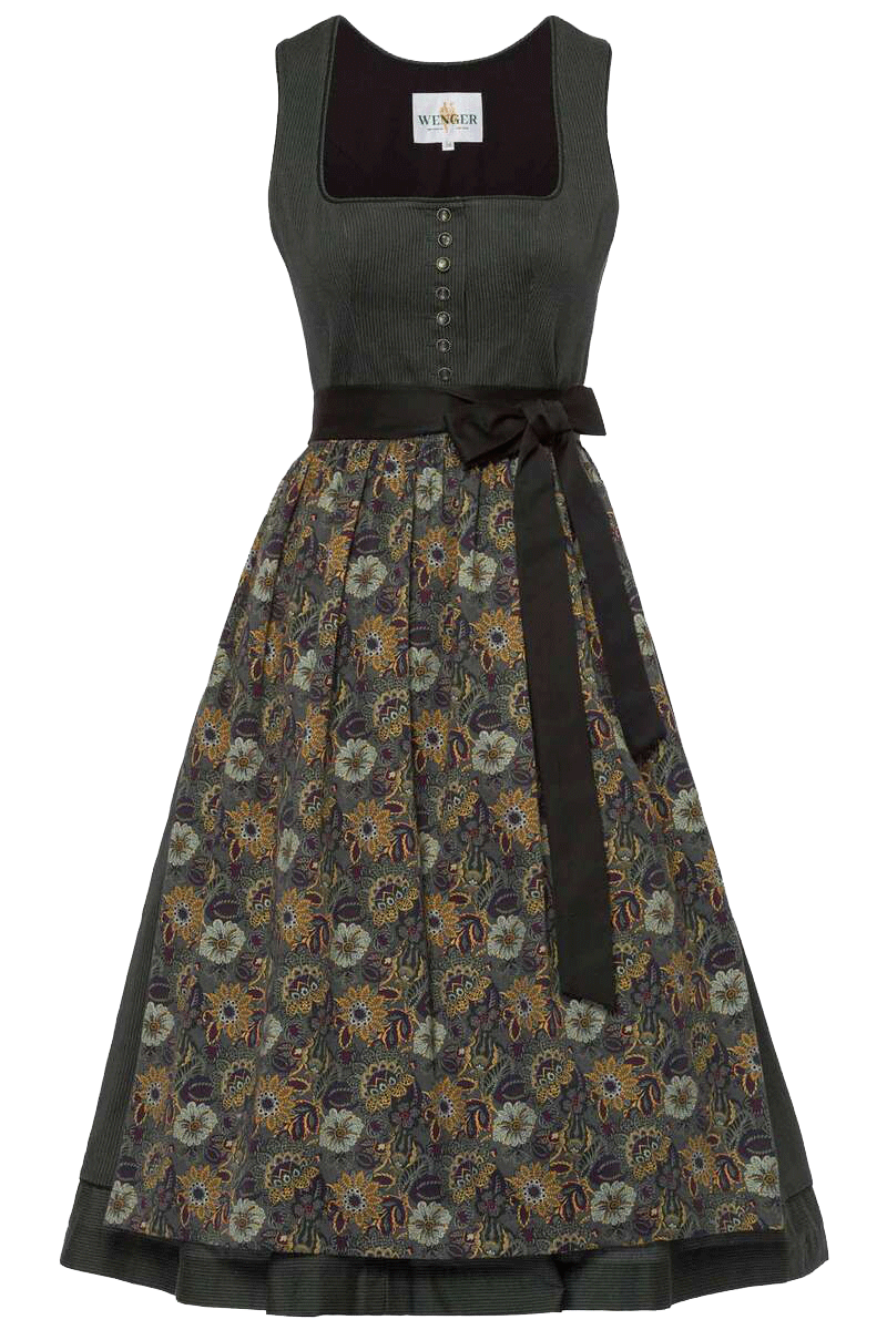 Dieses schicke lange dunkelgrün gemusterte Dirndl der Marke Wenger aus reiner Baumwolle und somit aus reiner Naturfaser ist nicht nur optisch wunderschön traditionell und dezent gestaltet, sondern auch im Tragekomfort kaum zu überbieten, denn sowohl der Oberstoff als auch das Futter des Dirndls bestehen aus reiner Baumwolle und sind daher sehr atmungsaktiv.Der Rock des Dirndls zeigt ein schönes dunkelgrün-gelbes Blumenmuster.Auch im Winter lässt sich dieses Dirndl wunderbar mit einer warmen Strumpfhose kombiniert tragen.Die Rocklänge in Größe 36 beträgt 75 cm.