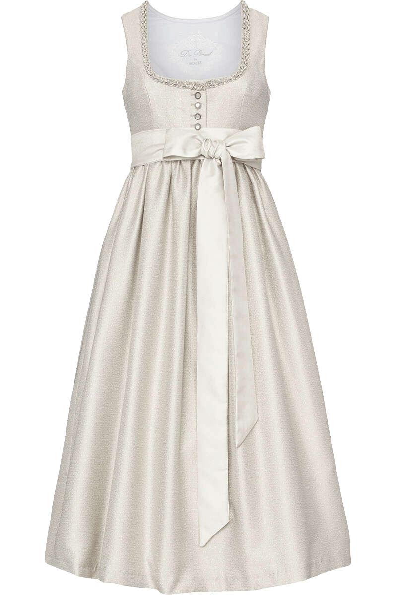 BIBIANA ist ein wunderschönes Umstands-Brautkleid in silber-schimmerndem steingrau aus der Brautkollektion "Die Braut" von Wenger. Der schönste Schmuck der werdenden Mama ist ihr wachsender Babybauch, der in dem schlichten Kleid wunderbar zur Geltung kommt und genügend Platz findet. Das Mieder aus hochwertigem Brokatstoff weist ein dezentes kleinteiliges Muster auf und wird von fünf hübschen Knöpfen mit Einlagen in Perlmuttoptik und Silbereinfassung geschlossen. Der runde Ausschnitt ist von Froschgoscherl-Rüschen mit kleinen Perlen umrandet. Der in kleine Falten gelegte Rock ist aus dem selben edlen Stoff gefertigt und hat eine Länge von 80 cm. Geschlossen wird das Kleid mit einem Reißverschluss auf der linken Seite.Besonderer Hingucker: Über dem Babybauch wird anstelle der traditionellen Schürze ein 6,5 cm breites gleichfarbiges Band gebunden.Das Mieder-Innenfutter aus reiner Baumwolle sorgt für einen hohen Tragekomfort.