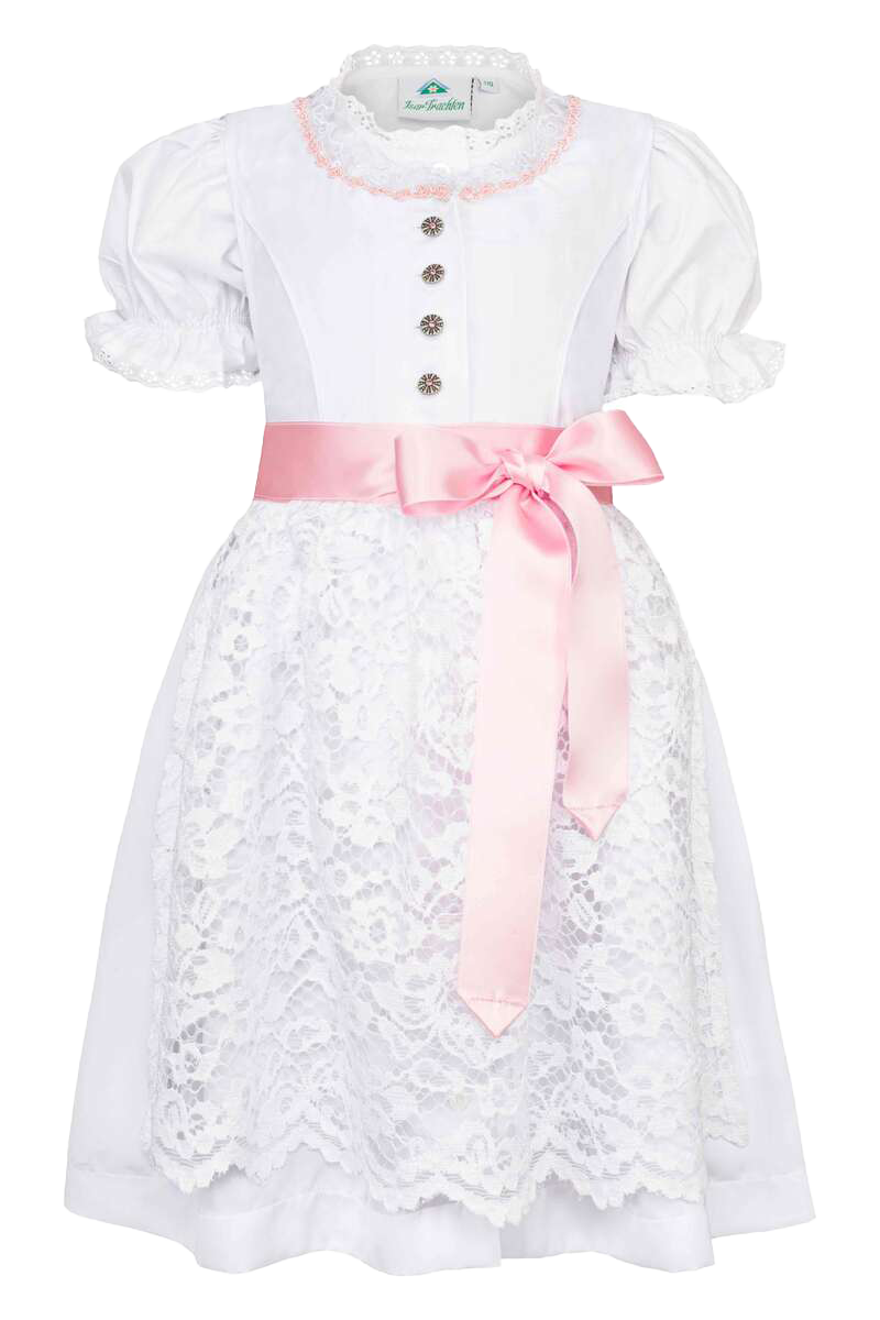 Sieht Ihre Tochter im Dirndl auch aus wie ein kleiner Engel? In diesem wunderschön verträumt romantischen weißen Dirndl der Marke Isar-Trachten ganz bestimmt. Neben der märchenhaften Schürze aus durchscheinender Spitze sorgt auch das rosafarbene Bindeband mit Schleife auf dem Bauch dafür, dass Ihr kleiner Schatz wie eine Prinzessin aussieht, wenn sie dieses Dirndl trägt, und auch die schöne verschnörkelte filigran gestaltete Borte am Halssaum, der zusätzlich mit weißer Spitze verziert ist.Die traditionell altsilbernen Knöpfe glänzen zusätzlich durch einen pinken Strassstein in der Mitte.Damit die Schürze nicht hinunterfällt, hat sie ein Knopfloch und kann vorne auf dem Bauch unter der Schleife unsichtbar am Dirndl befestigt werden. So kann sie Ihrem Schatz nicht verloren gehen.Wer ein wildromantisch-verträumtes Dirndl für seinen Lieblingsschatz sucht, ist hier also goldrichtig. Perfekt für Taufe, Kommunion & Hochzeit.Die Rocklänge in Größe 110 beträgt 38 cm.