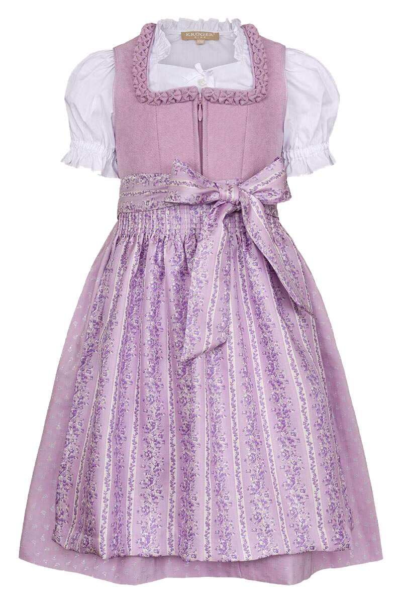Dieses wunderschöne, trendige Dirndl mit Cordoberteil in der zauberhaften Farbe lila bezaubert jedes Trachtenmädchen.Das Mieder aus Cordsamt wird vorne mit einem verdeckten Reißverschluss geschlossen, was das An- und Ausziehen erleichtert. Der Ausschnitt ist mit einer traditionellen Froschgoscherlrüsche verziert. Die mitgelieferte Bluse mit Puffärmeln und süßer Schleife am Ausschnitt rundet das Design ab.Der Rock ist mit einem filigranen Blumenmuster verziert. Im Kontrast dazu sorgt die fliederfarbene Schürze mit Blumenrankenmuster für den passenden Mustermix.In der Größe 110 beträgt die Rocklänge ca. 46 cm.