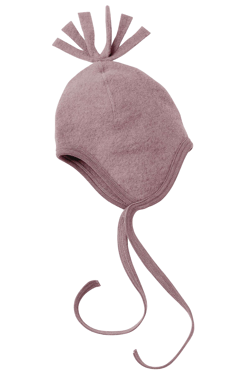 Die Mütze geht schön über die Ohren und kann dank der weichen Bindebändchen nicht verrutschen. Ein niedliches Detail sind die Bommelfransen aus Schurwolle am Oberkopf.