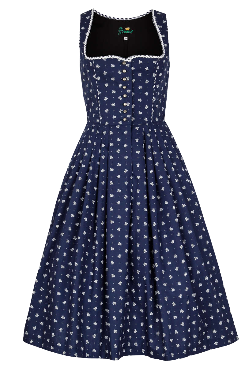Die passenden karierten Schürzen du diesem Dirndl finden Sie unter der Artikel.nr. S118121-2-7 und S118121-1-7 in den Farben beere, marine, schwarz, grün und rot.In seiner schlichten Form ist dieses Dirndl bestens geeignet, wenn auch im Alltag Tracht gefragt ist. Oberteil und Rock sind einheitlich aus demselben Baumwollstoff in Marine mit aufgedruckten Rosen gefertigt. Der Ausschnitt wird von einer schlichten weißen Bordüre und einem Saum in kleinem Karo geschmückt. Die mittige, schlichte Knopfleiste wird ebenfalls von zwei karierten Leisten gesäumt. Der Rock ist ca. 70 cm lang und hat zwei Einschubtaschen.