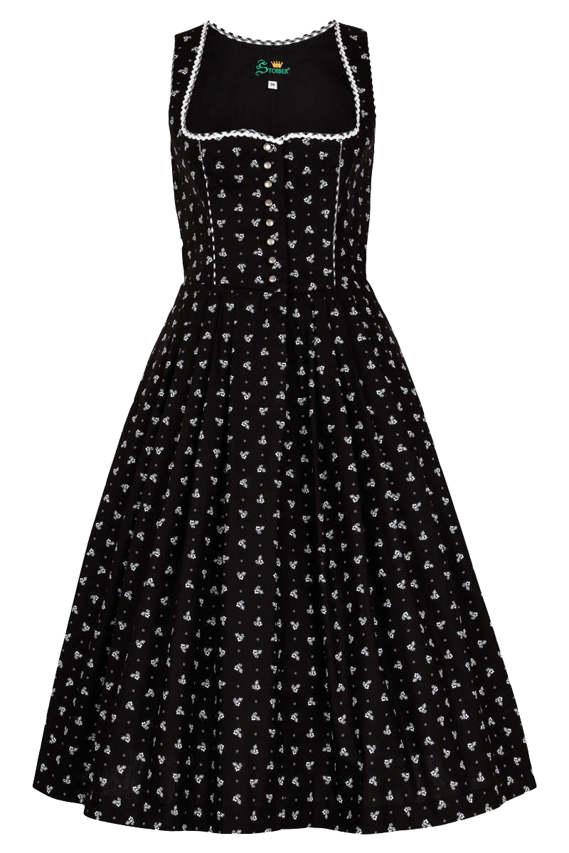 Die passenden karierten Schürzen du diesem Dirndl finden Sie unter der Artikel.nr. S118121-2-7 und S118121-1-7 in den Farben beere, marine, schwarz, grün und rot.In seiner schlichten Form ist dieses Dirndl bestens geeignet, wenn auch im Alltag Tracht gefragt ist. Oberteil und Rock sind einheitlich aus demselben Baumwollstoff in Schwarz mit aufgedruckten Rosen gefertigt. Der Ausschnitt wird von einer schlichten weißen Bordüre und einem Saum in kleinem Karo geschmückt. Die mittige, schlichte Knopfleiste wird ebenfalls von zwei karierten Leisten gesäumt. Der Rock ist ca. 70 cm lang und hat zwei Einschubtaschen.