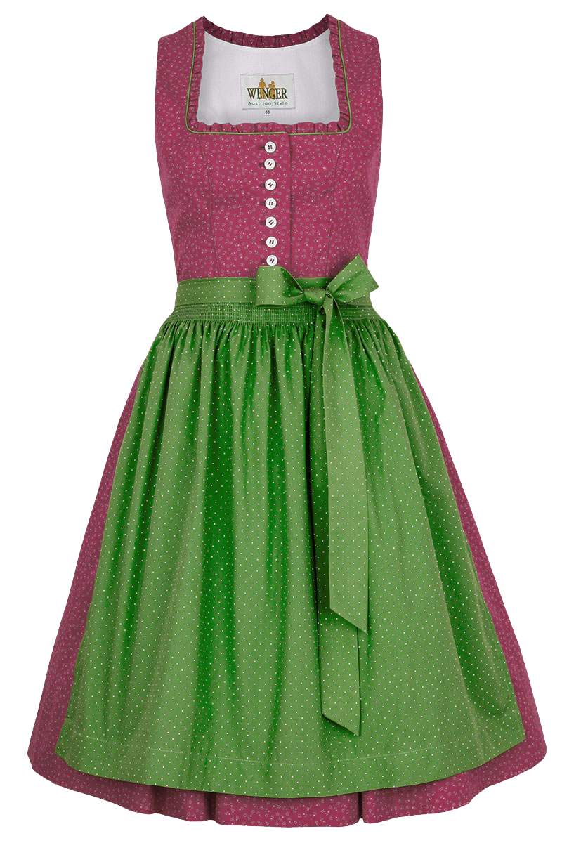 Das Dirndlkleid in Beere mit feinem Blütenmuster und die Schürze im kräftigen, weiß gepunkteten Grün bilden einen farbenfrohen Kontrast. Der tiefe Balkonausschnitt ist mit grüner Paspelierung und Rüschen im Grundstoff geschmückt. Weitere Zierelemente am Mieder sind die Knopfleiste in Perlmuttoptik und zwei schräg verlaufende Paspelierungen. Der ausgestellte Rock hat eine Einschubtasche rechts und eine Länge von ca. 60 cm.