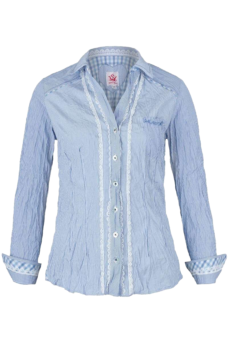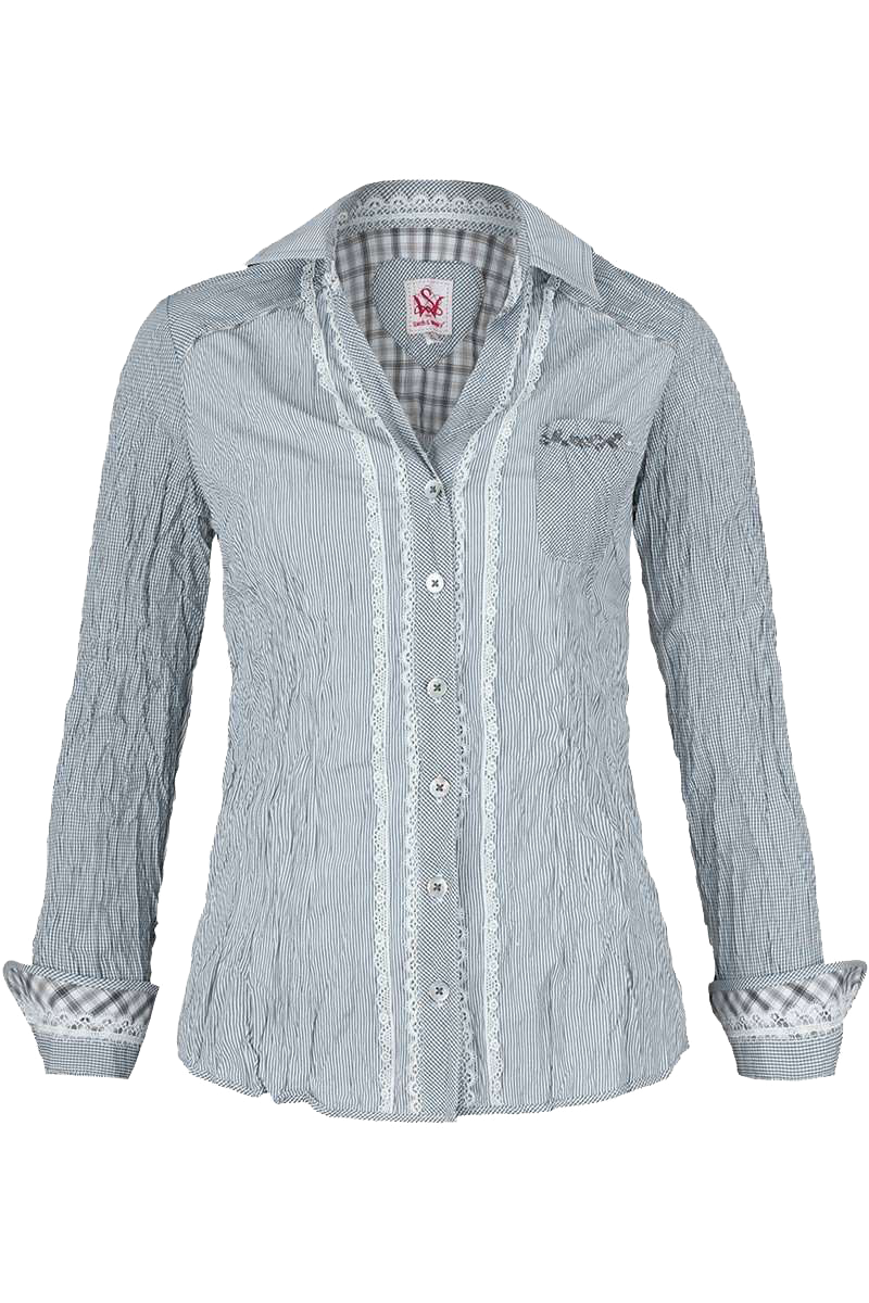 Diese moderne Bluse mit Crash-Effekt besticht durch einmaligen Mustermix aus kariertem und gestreiftem Stoff. Der Schultersattel, die Ärmel, die Knopfleiste, die Brusttasche und die Kragenunterseite sind in klein kariertem Stoff gearbeitet. Dagegen ist die Kragenoberseite, die Vorderseite und die Rückseite der Bluse aus gestreiftem Stoff gearbeitet. Auf der Brusttasche, den Ärmeln, sowie in der Mitte des Rückens ist eine blaue Zierstickerei angebracht. Die Bluse ist leicht tailliert geschnitten und sitzt perfekt durch die Taillenabnäher und die Rückenpasse. Die Außenseite des Kragens, die Innenseite der Knopfleiste, die Ärmelmanschetteninnenseite und die Ellenbogenpatches sind auffällig mit grob kariertem Stoff abgesetzt. An der Innenseite des Kragens, der Innenseite der Ärmelmanschetten und rechts und links der Knopfleiste verlaufen Streifen aus weißer Spitze. Die Knöpfe der Bluse sind in Perlmutt gehalten.