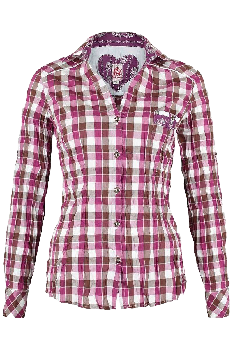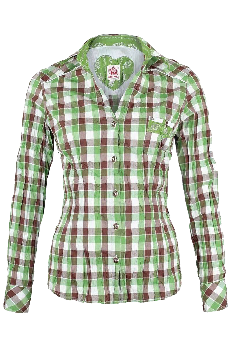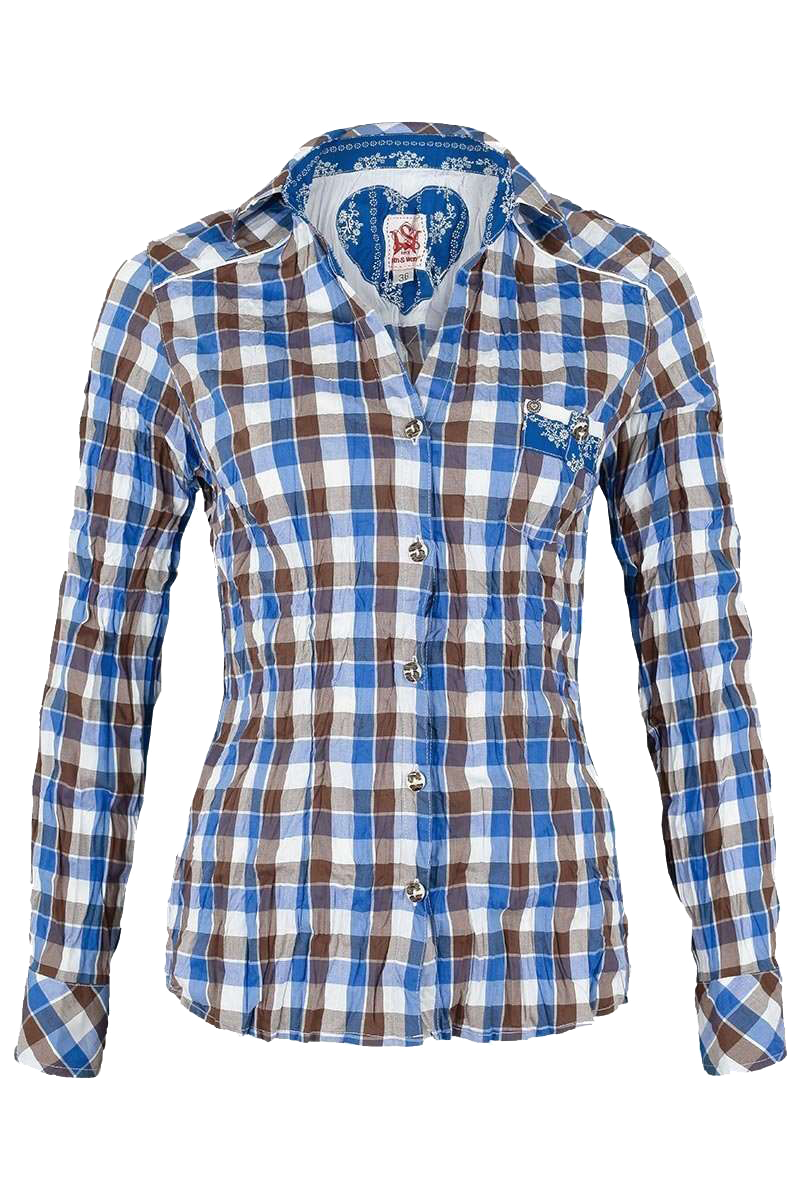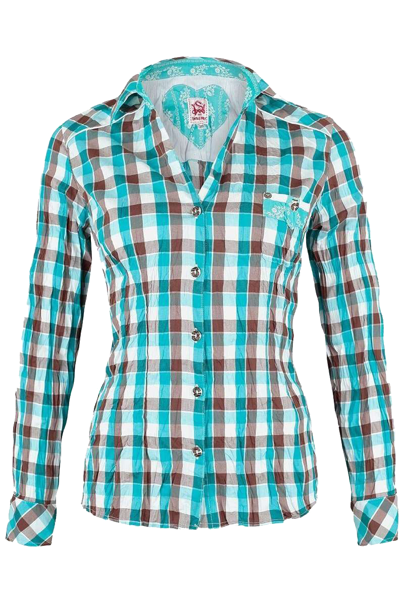 Diese süße und moderne weiß-türkis-braun karierte Bluse mit Crash-Effekt gehört in jeden Kleiderschrank. Sie ist leicht tailliert geschnitten und sitzt perfekt durch die zweifachen Taillenabnäher und die Rückenpasse. Die Außenseite des Kragens, ein Band an der Innenseite des Kragens, die Ärmelmanschetteninnenseite und der Abschluss der Brusttasche sind mit türkis-weiß geblümtem Stoff eingefasst. Auf dem Rücken der Bluse ist in der Mitte eine Applikation aus demselben Stoff angebracht. Die Bluse verfügt über eine Brusttasche auf der linken Brust. Auf der Brusttasche und an beiden Seiten des Schultersattels ist ein kleines Metallemblem mit einem Herz darauf angebracht. Die Knöpfe der Bluse sind in Hirschhornoptik gehalten. Auch in der Mitte der Ärmel ist ein Knopf in Hirschhornoptik angebracht, mittels diesem man die Ärmel beim hochkrempeln fixieren kann. Der Knopf ist ebenfalls mit dem geblümten Stoff unterlegt.
