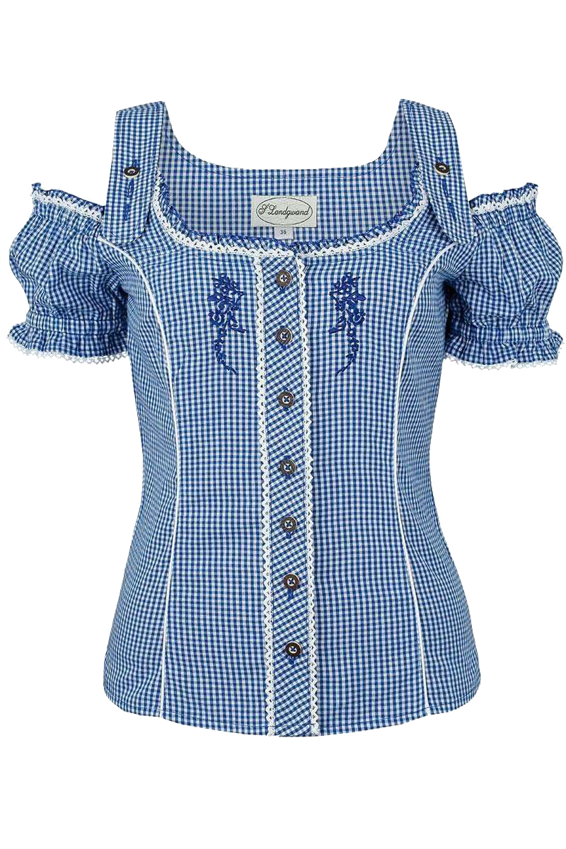 Diese süße und trachtige Carmenbluse verfügt über ein paar niedliche Details. Die Trägerchen der Bluse sind mittels zwei Hirschhornknöpfen höhenverstellbar. Die Ärmelchen sind am Abschluss oben sowie unten leicht gerafft und mit einer weißen Rüschenbordüre umrandet. Auch den Ausschnitt ziert eine weiße Rüschenbordüre. Die Abnäher sind einfarbig weiß gestaltet, was einen tollen Kontrast bildet. Hinten ist eine zarte Zierschnürung aus transparenten, weißen Band angebracht. Die Knopfleiste ist mit Knöpfen in Hirschhornoptik versehen und links sowie rechts von einer Rüschenbordüre umrandet. Das Karomuster ist auf der Knopfleiste gedreht. Links und rechts der Knopfleiste ist eine aufwendige Zierstickerei in blau angebracht.