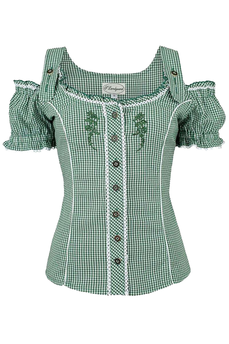 Diese süße und trachtige Carmenbluse verfügt über ein paar niedliche Details. Die Trägerchen der Bluse sind mittels zwei Hirschhornknöpfen höhenverstellbar. Die Ärmelchen sind am Abschluss oben sowie unten leicht gerafft und mit einer weißen Rüschenbordüre umrandet. Auch den Ausschnitt ziert eine weiße Rüschenbordüre. Die Abnäher sind einfarbig weiß gestaltet, was einen tollen Kontrast bildet. Hinten ist eine zarte Zierschnürung aus transparenten, weißen Band angebracht. Die Knopfleiste ist mit Knöpfen in Hirschhornoptik versehen und links sowie rechts von einer Rüschenbordüre umrandet. Das Karomuster ist auf der Knopfleiste gedreht. Links und rechts der Knopfleiste ist eine aufwendige Zierstickerei in grün angebracht.