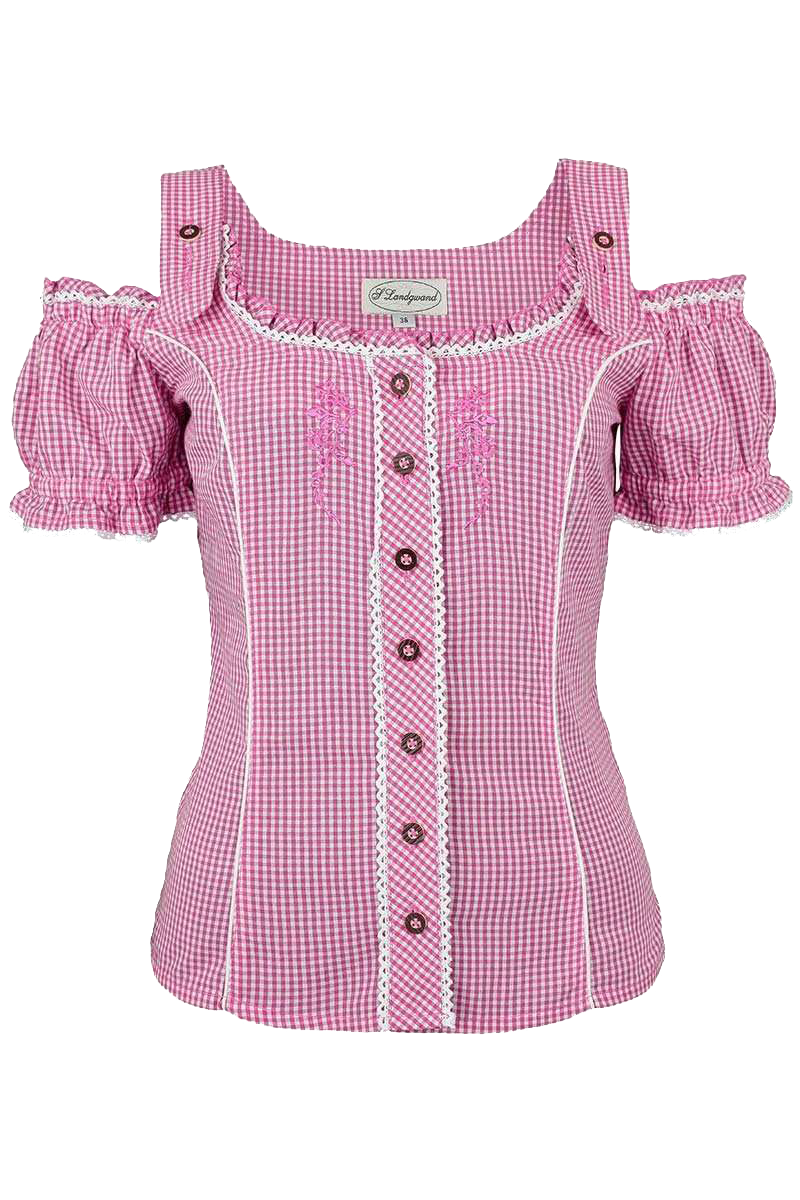 Diese süße und trachtige Carmenbluse verfügt über ein paar niedliche Details. Die Trägerchen der Bluse sind mittels zwei Hirschhornknöpfen höhenverstellbar. Die Ärmelchen sind am Abschluss oben sowie unten leicht gerafft und mit einer weißen Rüschenbordüre umrandet. Auch den Ausschnitt ziert eine weiße Rüschenbordüre. Die Abnäher sind einfarbig weiß gestaltet, was einen tollen Kontrast bildet. Hinten ist eine zarte Zierschnürung aus transparenten, weißen Band angebracht. Die Knopfleiste ist mit Knöpfen in Hirschhornoptik versehen und links sowie rechts von einer Rüschenbordüre umrandet. Das Karomuster ist auf der Knopfleiste gedreht. Links und rechts der Knopfleiste ist eine aufwendige Zierstickerei in pink angebracht.