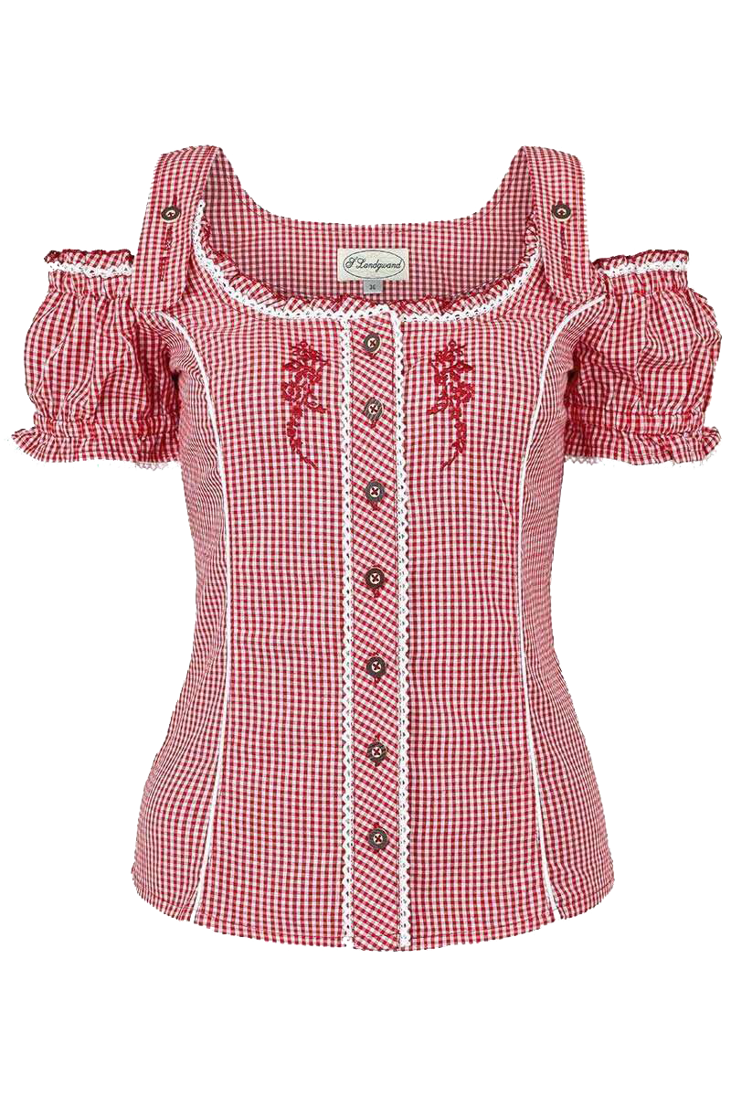 Diese süße und trachtige Carmenbluse verfügt über ein paar niedliche Details. Die Trägerchen der Bluse sind mittels zwei Hirschhornknöpfen höhenverstellbar. Die Ärmelchen sind am Abschluss oben sowie unten leicht gerafft und mit einer weißen Rüschenbordüre umrandet. Auch den Ausschnitt ziert eine weiße Rüschenbordüre. Die Abnäher sind einfarbig weiß gestaltet, was einen tollen Kontrast bildet. Hinten ist eine zarte Zierschnürung aus transparenten, weißen Band angebracht. Die Knopfleiste ist mit Knöpfen in Hirschhornoptik versehen und links sowie rechts von einer Rüschenbordüre umrandet. Das Karomuster ist auf der Knopfleiste gedreht. Links und rechts der Knopfleiste ist eine aufwendige Zierstickerei in rot angebracht.