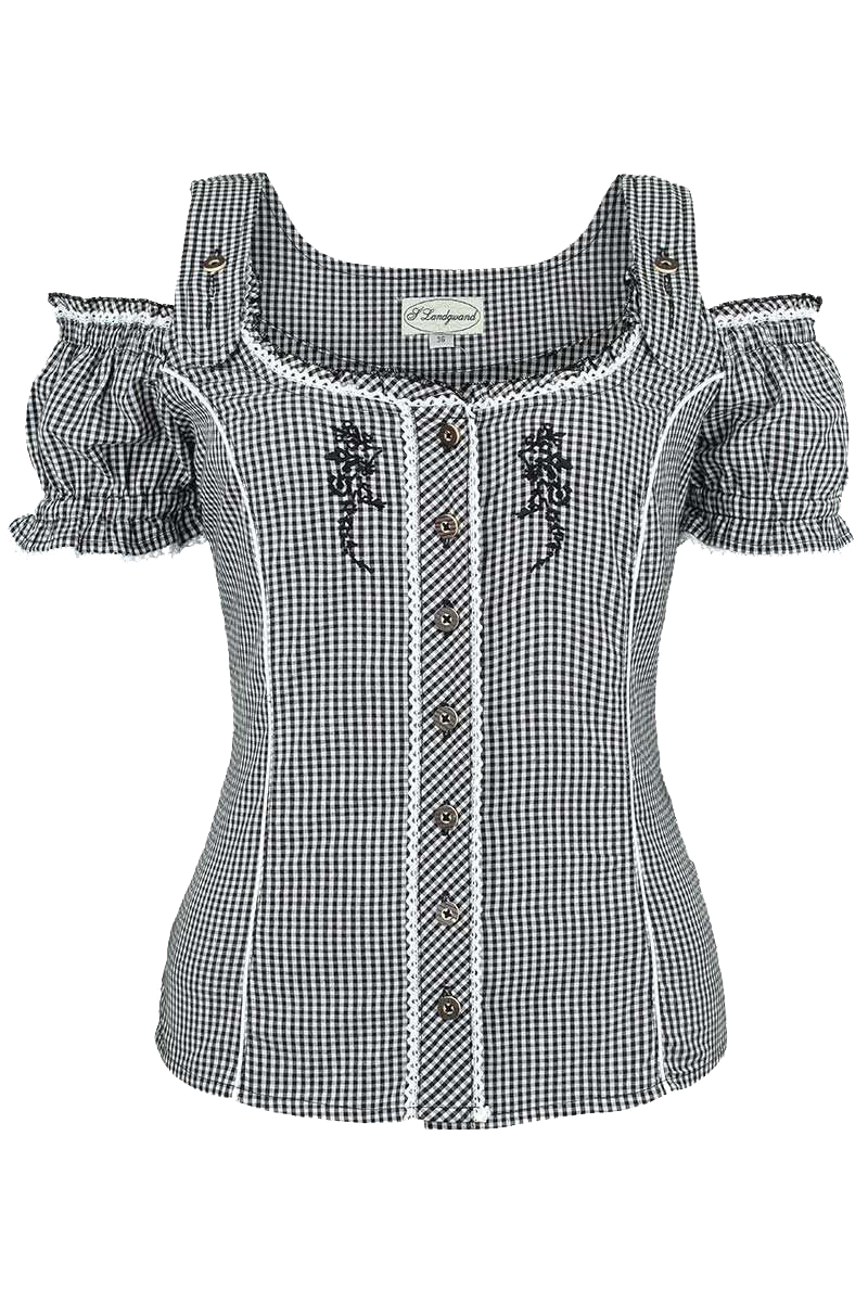 Diese süße und trachtige Carmenbluse verfügt über ein paar niedliche Details. Die Trägerchen der Bluse sind mittels zwei Hirschhornknöpfen höhenverstellbar. Die Ärmelchen sind am Abschluss oben sowie unten leicht gerafft und mit einer weißen Rüschenbordüre umrandet. Auch den Ausschnitt ziert eine weiße Rüschenbordüre. Die Abnäher sind einfarbig weiß gestaltet, was einen tollen Kontrast bildet. Hinten ist eine zarte Zierschnürung aus transparenten, weißen Band angebracht. Die Knopfleiste ist mit Knöpfen in Hirschhornoptik versehen und links sowie rechts von einer Rüschenbordüre umrandet. Das Karomuster ist auf der Knopfleiste gedreht. Links und rechts der Knopfleiste ist eine aufwendige Zierstickerei in schwarz angebracht.