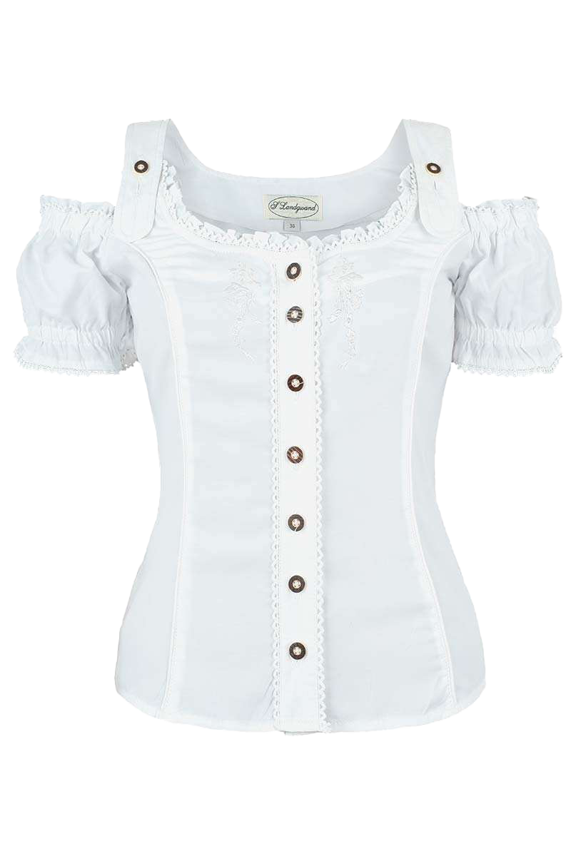 Diese süße und trachtige Carmenbluse verfügt über ein paar niedliche Details. Die Trägerchen der Bluse sind mittels zwei Hirschhornknöpfen höhenverstellbar. Die Ärmelchen sind am Abschluss oben sowie unten leicht gerafft und mit einer weißen Rüschenbordüre umrandet. Auch den Ausschnitt ziert eine weiße Rüschenbordüre. Die Abnäher sind einfarbig weiß gestaltet. Hinten ist eine zarte Zierschnürung aus transparenten, weißen Band angebracht. Die Knopfleiste ist mit Knöpfen in Hirschhornoptik versehen und links sowie rechts von einer Rüschenbordüre umrandet. Links und rechts der Knopfleiste ist eine aufwendige Zierstickerei in weiß angebracht.
