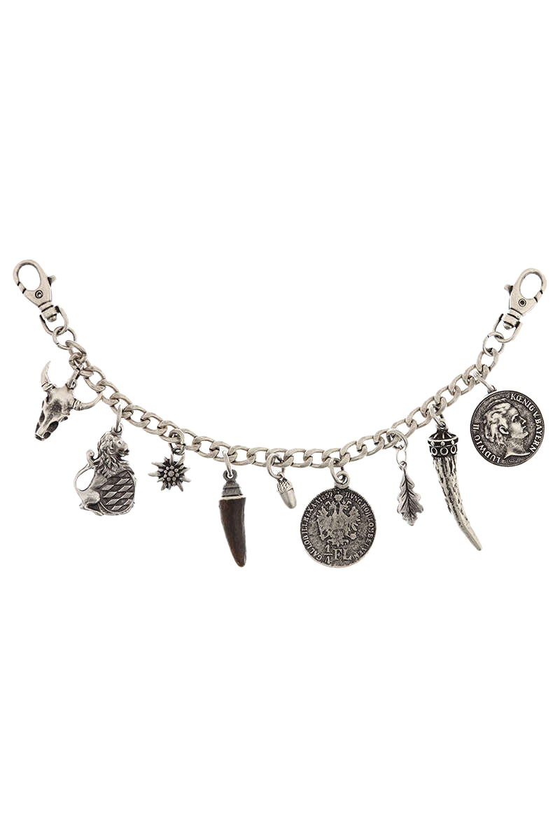 Dieser silberfarbene Charivari gehört an jede jede Lederhose. Das 32 cm lange schwere Gliederkette ist mit großen Abzeichen der Jagd und Bayern-Tradition bestückt. Das Teil wird mit Karabinern links und rechts des Hosenlatzes eingehängt.
