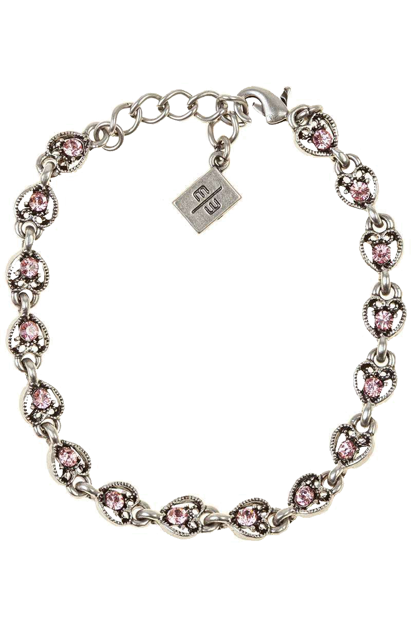 Ein romantisches Armband in Altsilber von Silkdrops. Das circa 20 cm lange und über Kettenglieder um 3 cm erweiterbare Band ist aus kleinen herzförmigen Gliedern zusammengesetzt, die mittig mit rosafarbenen Glitzersteinen besetzt sind. Das Band wird mit einem Karabiner geschlossen.