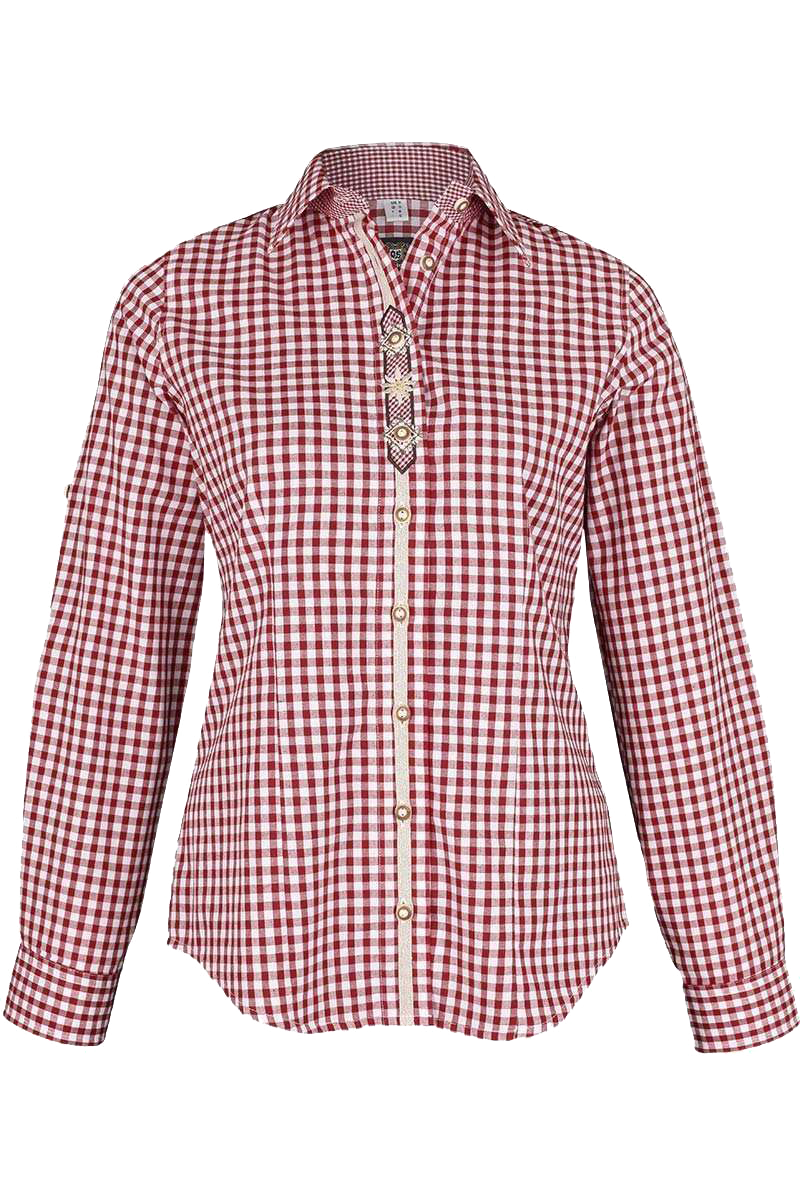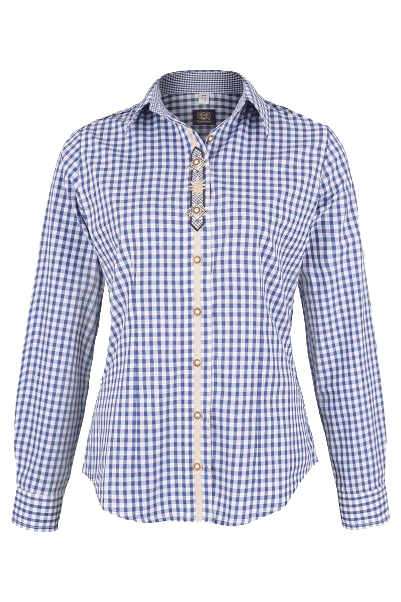 Diese klassische Krempelarm Bluse besticht durch den tollen Mix aus großem und kleinem Karomuster. Der Übergang zum Schultersattel, sowie der Steg des Kragens und die Stege zur Befestigung der Krempelärmel sind mit einem kleinen Karomuster versehen. Dagegen ist der Rest der Bluse mit einem groben Karomuster übersäht. Die Knopfleiste ist mit einem grob gewebten, beigen Band versehen. Oben sind zwei Knöpfe in ein Muster eingestickt. Dort ist in der Mitte zwischen diesen zwei Knöpfen ein Edelweiß eingestickt. Zudem sind beide Knöpfe mit einem floralen Muster umstickt. Im Hintergrund findet sich wieder das kleine Karomuster. Beide Links und rechts der Knopfleiste sind jeweils fünf Biesen angebracht. Diese Biesen. Die Bluse ist leicht tailliert geschnitten und sitzt perfekt durch die Taillenabnäher und die Rückenpasse. Die Knöpfe der Bluse sind in Hirschhornoptik gehalten.