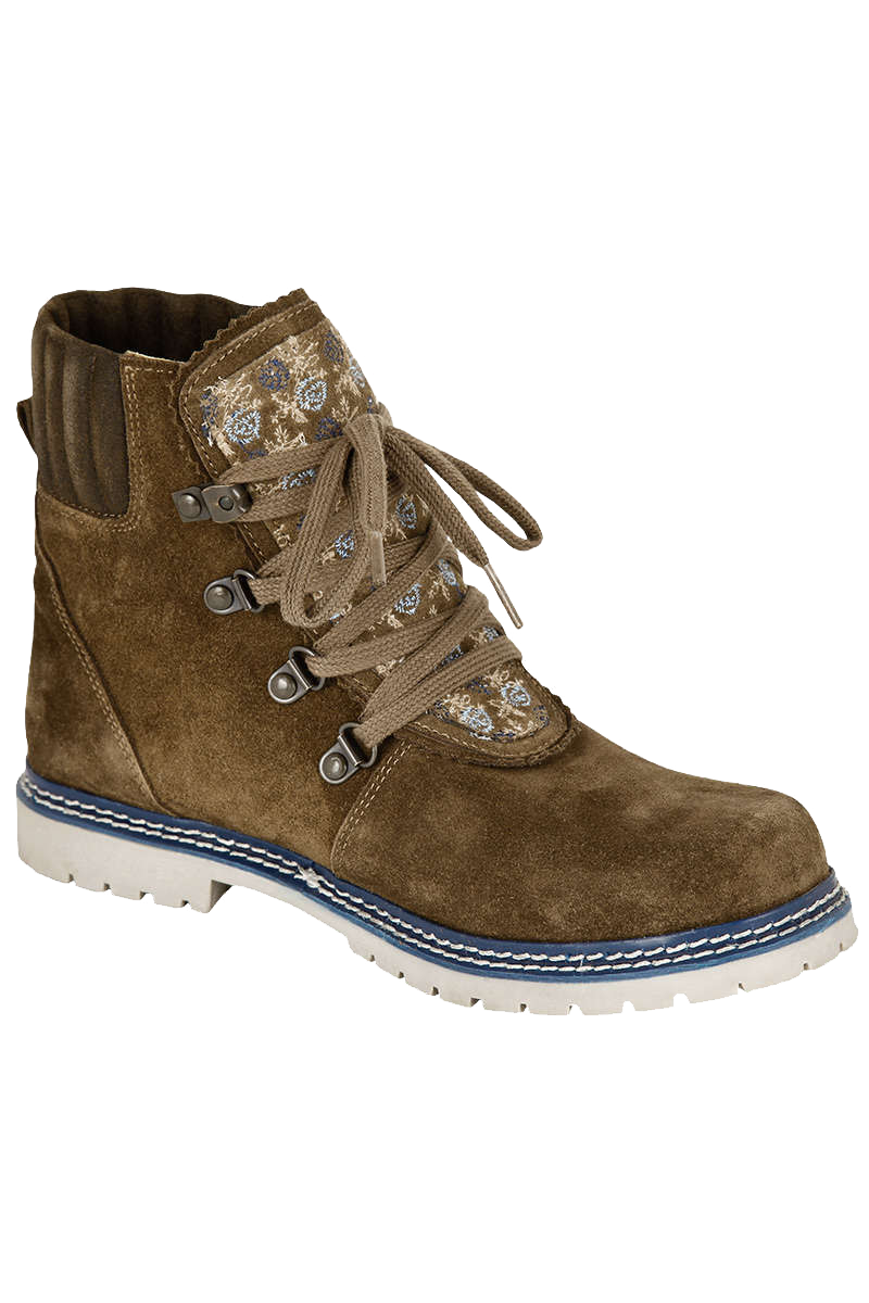 Der knöchelhohe Damenstiefel aus mittelbraunem Wildleder ist der ideale Begleiter, wenn ein modisch/rustikales Outfit angesagt ist. Die auffallend bestickte Zunge, die blau gehaltene Sohlenrahmung mit weißer Doppelnaht und die helle Profilsohle bilden markante Schmuckelemente, die den Schuh hervorheben. Der Knöchelabschluss mit der abgesteppten Polsterung sorgt mit dem Innenschuh aus Leder und dem weichen Fußbett für exzellenten Tragekomfort