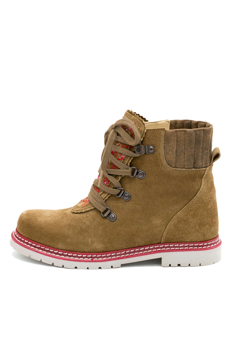 Der knöchelhohe Damenstiefel aus mittelbraunem Wildleder ist der ideale Begleiter, wenn ein modisch/rustikales Outfit angesagt ist. Die auffallend bestickte Zunge, die rot gehaltene Sohlenrahmung mit weißer Doppelnaht und die helle Profilsohle bilden markante Schmuckelemente, die den Schuh hervorheben. Der Knöchelabschluss mit der abgesteppten Polsterung sorgt mit dem Innenschuh aus Leder und dem weichen Fußbett für exzellenten Tragekomfort.