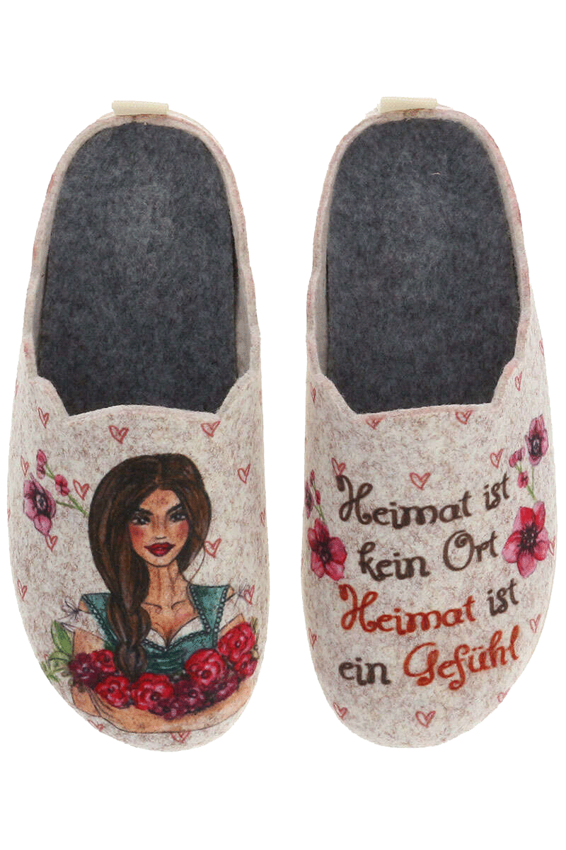 Jetzt wird´s gemütlich! Mit dem schicken beigen Damen-Hausschuh GABRIELA von Xaver Louis aus klassischem wärmendem Filz kommt echtes Hüttenfeeling auf! Er ist sowohl bequem als auch äußerst stylisch: Der rechte Schuh zeigt das Portrait einer schönen brünetten Trachtlerin, der linke Schuh den herzlichen Spruch 'Heimat ist kein Ort - Heimat ist ein Gefühl'. Die Filzkante schließt in einem verspielten Wellenschnitt ab. Die bequeme Einlegesohle ist aus leicht nachgiebigem Material gefertigt, welches für sehr hohen Tragekomfort sorgt. Der Fuß steht auf grauem wolligem Stoff, und einer stabilen Gummilaufsohle, was für zusätzliche Wärme sorgt. Um alle Wünsche an einen perfekten Hausschuh zu erfüllen, duften die Schuhe zusätzlich ganz leicht nach einer blumigen Note. Dieser Schuh wurde in Spanien in handarbeit hergestellt.Der Schuh fällt klein aus- am Besten eine Größe größer bestellen.Eine hübsche Geschenkidee für alle, die es sich gern zu Hause gemütlich machen.