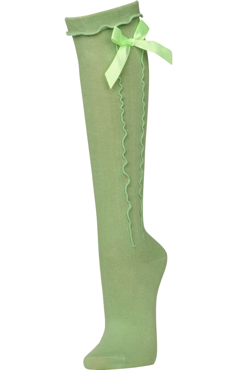 Trendiger Dirndlstrumpf mit Satinschleife und eingestrickter Rüsche. Passt gut zum Dirndl und zur Lederhose. Die Spitze ist handgekettelt, Elasthan sorgt für eine gute Anpassung an der Wade.