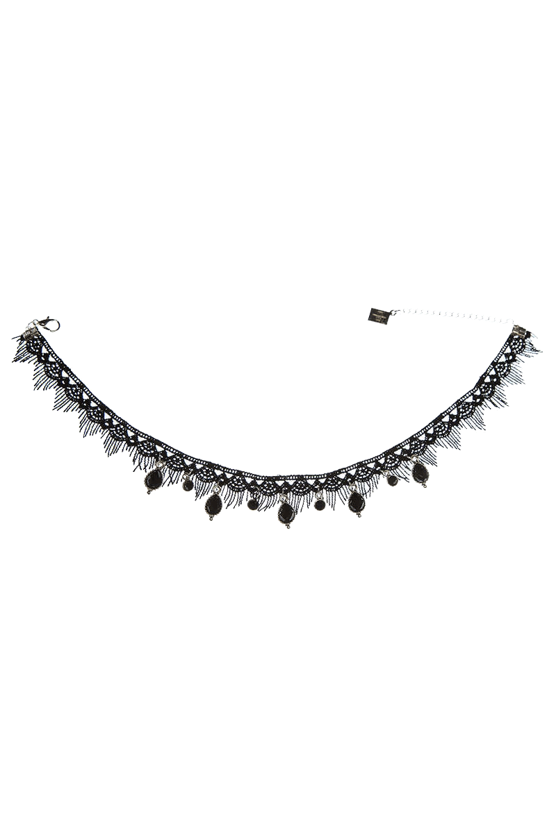 Zierlich gearbeites Kropfband mit Kordelfransen und mit tropfenförmigen schwarzen Strass-Steinen. Zaubert einen leichten Hauch von Nostalgie auf jedes Dekoltee.Wird durch großen Karabiner mit variabler Verschluss-Gliederkette geschlossen.