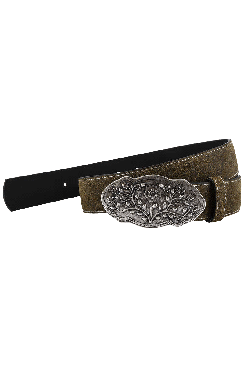Die angeraute Oberfläche des braunen Leders verleiht diesem Damengürtel von Sildrops Accessoires einen unverwechselbaren old fashioned Style. Dieser wird von der schweren, geschwungenen Metallschließe in Altsilber noch verstärkt. Die Oberfläche der Schließe wird von einem Relief aus Blumenranken verziert.