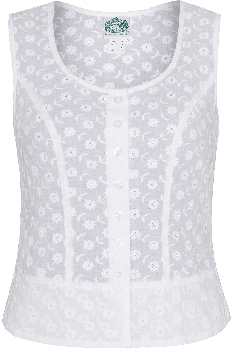 Die ärmellose Trachtenbluse MONA von Hammerschmid begeistert mit zartem Blümchen-Lochmuster und femininer Silhouette – perfekt für warme Tage und vielseitige Kombinationen.