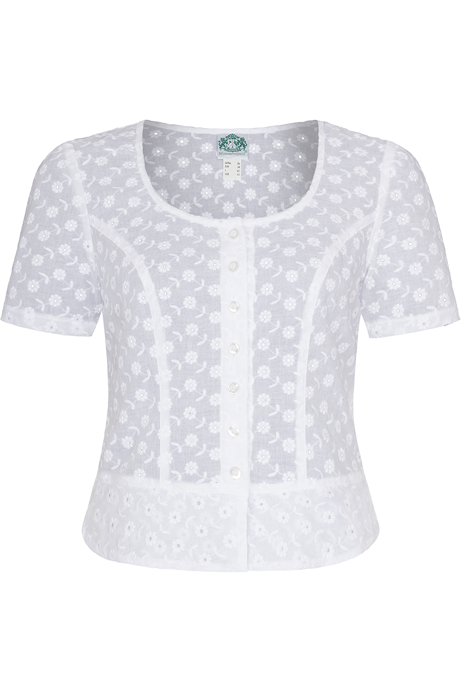Die kurze Trachtenbluse MANUELA von Hammerschmid überzeugt mit zartem Blümchen-Lochmuster und femininem Schnitt – ein stilvoller Begleiter für Trachtenlooks oder den Alltag.